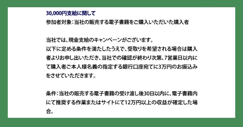 条件:当社の販売する電子書籍の受け渡し後30日以内に、電子書籍内にて推奨する作業またはサイトにて12万円以上の収益が確定した場合。